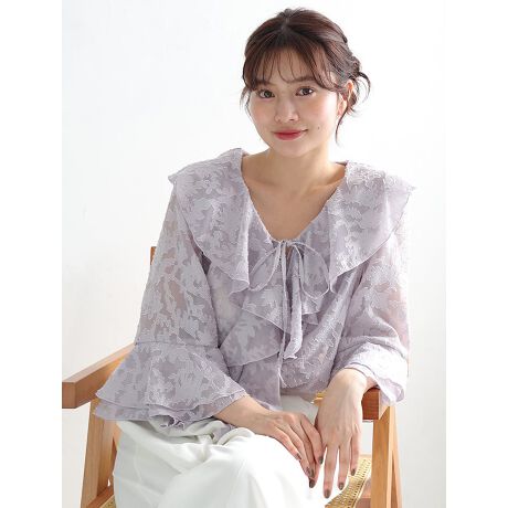 シアー感と繊細なジャガードが女性らしい印象のトップス。襟の大きなフリルがおしゃれ度を高めてくれます。カジュアルなデニムパンツにもフェミニンなスカートにも合わせやすく、様々なスタイリングが楽しめるアイテムです。