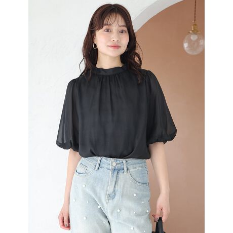 シアー感のある素材に立体的なパフスリーブがかわいらしいブラウスです。ほどよい透け感と、ハイネックが上品なイメージを演出してくれます。カジュアルなデニムにもフェミニンなスカートにも合わせやすく、様々なスタイリングが楽しめるアイテムです。