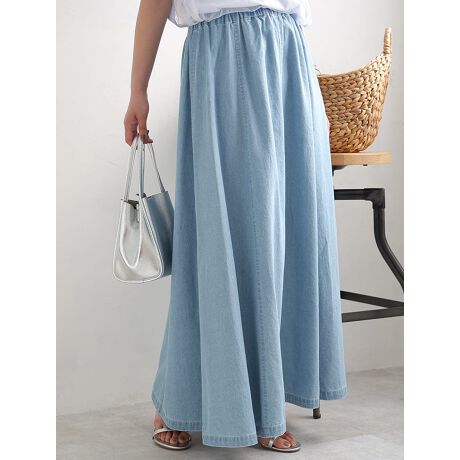 裾に向かってフレアに広がるシルエットが女性らしい雰囲気を演出してくれる配色ステッチデニムロングスカートです。シンプルなデザインで合わせるトップスを選ばず、カジュアルにもきれいめにも幅広いスタイリングに活躍するアイテムです。