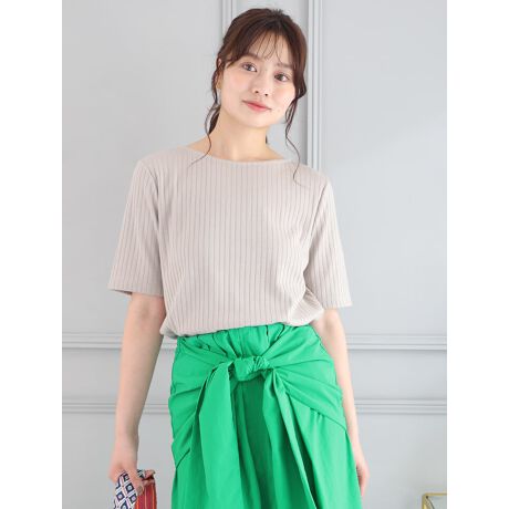横に広く開いたボートネックが首元をすっきりと見せてくれるリブプルオーバー。五分袖で二の腕を隠してくれるのもうれしいポイント。汗ジミ防止で暑い日も安心です。一枚ではもちろん、ジャケットやサロペットのインナーなどと相性のいいアイテムです。