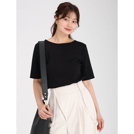 横に広く開いたボートネックが首元をすっきりと見せてくれるリブプルオーバー。五分袖で二の腕を隠してくれるのもうれしいポイント。汗ジミ防止で暑い日も安心です。一枚ではもちろん、ジャケットやサロペットのインナーなどと相性のいいアイテムです。