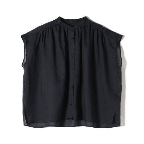 ギャザーをたっぷり施した程よくゆったりしたシルエットのバンドカラーブラウス。