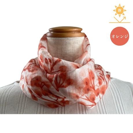 首周りを紫外線から守るスカーフ。誰でも簡単に巻けるように、首の後ろにあるマジックテープを留めるだけでふんわりオシャレにまとまります。