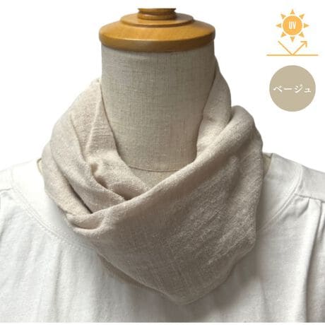 首周りを紫外線から守るスカーフ。誰でも簡単に巻けるように、首の後ろにあるマジックテープを留めるだけでふんわりオシャレにまとまります。