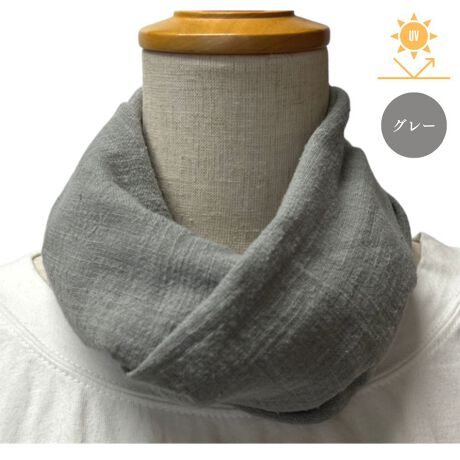 首周りを紫外線から守るスカーフ。誰でも簡単に巻けるように、首の後ろにあるマジックテープを留めるだけでふんわりオシャレにまとまります。