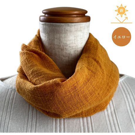 首周りを紫外線から守るスカーフ。誰でも簡単に巻けるように、首の後ろにあるマジックテープを留めるだけでふんわりオシャレにまとまります。