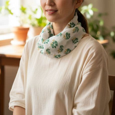 首周りを紫外線から守るスカーフ。誰でも簡単に巻けるように、首の後ろにあるマジックテープを留めるだけでふんわりオシャレにまとまります。