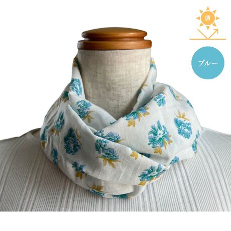 首周りを紫外線から守るスカーフ。誰でも簡単に巻けるように、首の後ろにあるマジックテープを留めるだけでふんわりオシャレにまとまります。