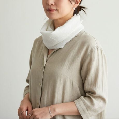 首周りを紫外線から守るスカーフ。誰でも簡単に巻けるように、首の後ろにあるマジックテープを留めるだけでふんわりオシャレにまとまります。
