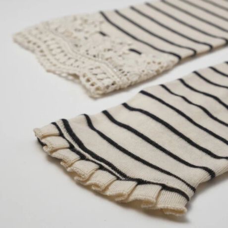 ボーダーレースUVアームカバー手袋は、ボーダー生地の上にレース、指先にフリルをあしらい、綿100%で作られたかわいいデザインです。