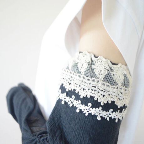 腕が細く見えるように肘の部分に絞りを作ったUVアームカバー。絞りを作ることで生地のたるみを無くし、腕を細く見せることが可能です。