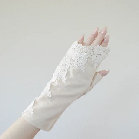 [型番:S028]大柄のレースをふんだんに使用したUVアームカバー手袋。ベーシックでナチュラルなデザイン。指先が使えるタイプなので、スマホを操作したり手作業が容易になります。ショートタイプ。滑り止め付き。