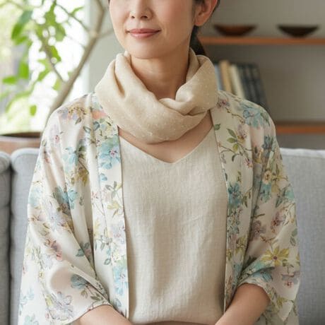 ファッションに合わせて、首の前で前で留めるスタイルも。外出時や運転時、ガーデニングにぴったり。様々なシーンでご活用いただけます。
