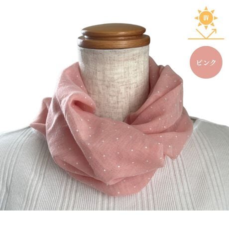 首周りを紫外線から守るスカーフ。誰でも簡単に巻けるように、首の後ろにあるマジックテープを留めるだけでふんわりオシャレにまとまります。