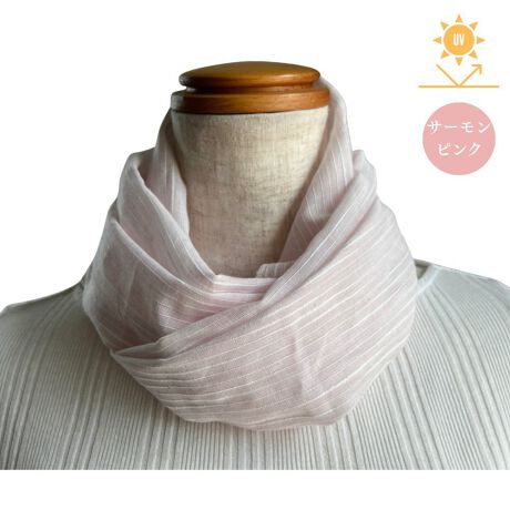 首周りを紫外線から守るスカーフ。誰でも簡単に巻けるように、首の後ろにあるマジックテープを留めるだけでふんわりオシャレにまとまります。