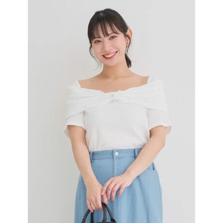 ビジュー付きリボンオフショルトップス