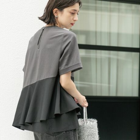 ・ペプラム部分を別素材で切替えた、ドッキングデザイントップス。