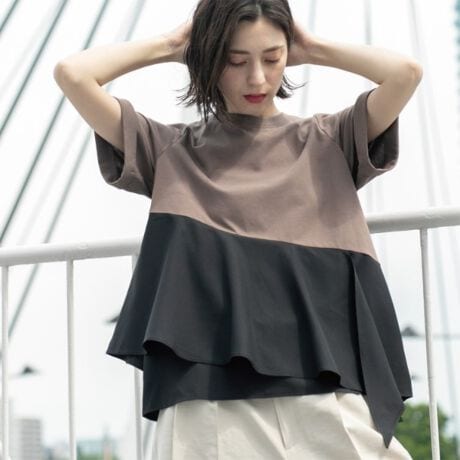 アシンメトリーヘムが目を惹くドッキングデザイントップス