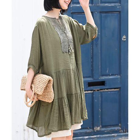 胸元のかぎ針レースがリッチな雰囲気を醸し出すブラウスチュニック。