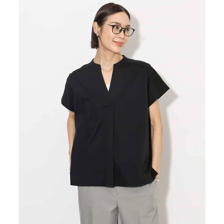 スキッパーシャツのようなデザインのカットソー。涼しく着れるゆったりとしたシルエットながら、きちんと感もあるので、オフィスや、夏のお出かけにも活躍してくれそうな一枚です。胸元にスナップボタンがついているので、中見え防止になっております。40サイズは限定店舗展開です。