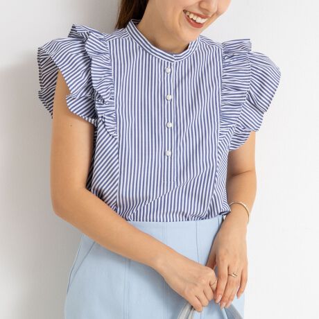 オフィスにもオフにも着まわせそうな、ブラウスです。肩のフリルがよいボリュームで、うまく体型カバーをしてくれます。