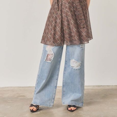 トレンドのワイドシルエットにダメージ加工をプラス。
