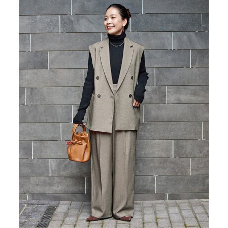 ジレはテーラード襟をつけ少し大人な印象にし、何にでも合わせやすい着丈が使いやすく、パンツは2タックを入れてセンタープレスが入っているので縦長見えし、ジレとセットでマスキュリンで女性らしさもある印象で着ていただけます。