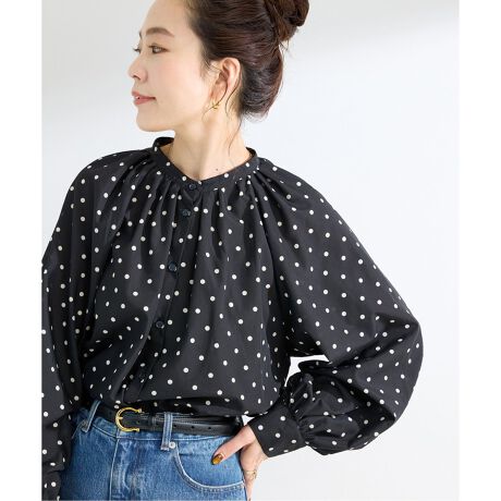 天然タッチのシアーポリエステルに小さめのドットがプリントされたスタンドカラーブラウスです。