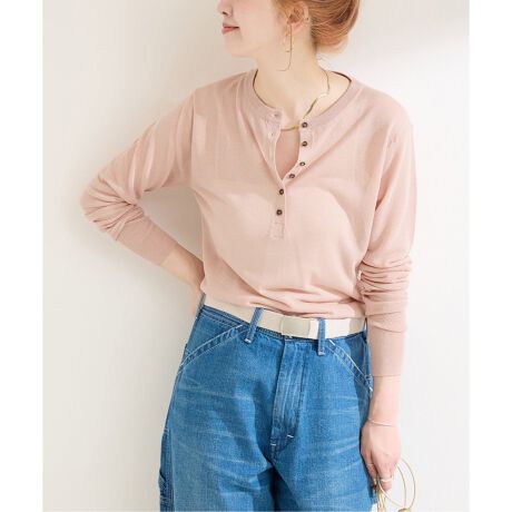 程よいサイズ感で肌離れがよくドライタッチなのが特徴で、リラックス感のあるヘンリーネックデザインが普段使いとしても気軽に着れるアイテムです。強撚のレーヨンナイロン糸で透け感が強すぎず、あえてウォーム感のある色味でお作りし大人っぽい雰囲気にしています。手洗い可能でご自宅でのイージーケアができるのも嬉しいポイントです!
