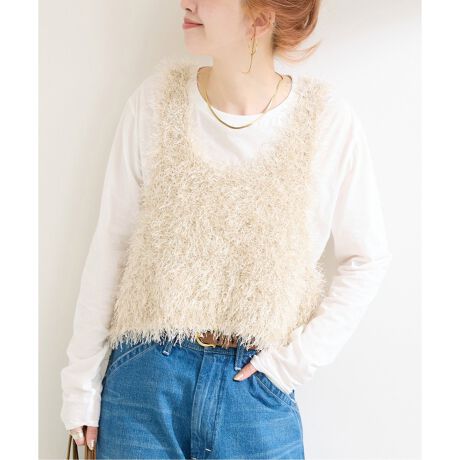 毛足の長いフェザー系のラメ入りシャギー糸で編んだニットベストに、薄手の儚げな雰囲気のある無地のロンTをセットにしたレイヤードアイテムです。