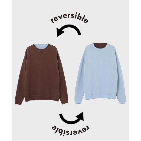表裏の配色が特徴的な、リバーシブル仕様のクルーネックニット。