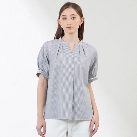 スタンドカラーのスキッパーデザインのプルオーバーです。衿や袖にはタックディテールを入れて女性らしい印象のデザインです。ふんわりとしたフォルムは二の腕のラインをカバーし腕を華奢に見せてくれるのが嬉しいポイント。カフスにはコードパイピングを効かせて、フェミニンなアクセントをプラスしました。
