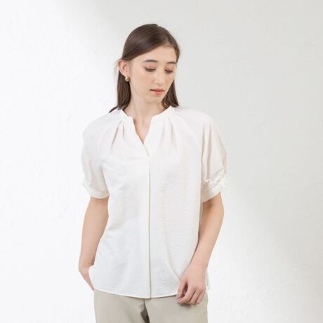 スタンドカラーのスキッパーデザインのプルオーバーです。衿や袖にはタックディテールを入れて女性らしい印象のデザインです。ふんわりとしたフォルムは二の腕のラインをカバーし腕を華奢に見せてくれるのが嬉しいポイント。カフスにはコードパイピングを効かせて、フェミニンなアクセントをプラスしました。