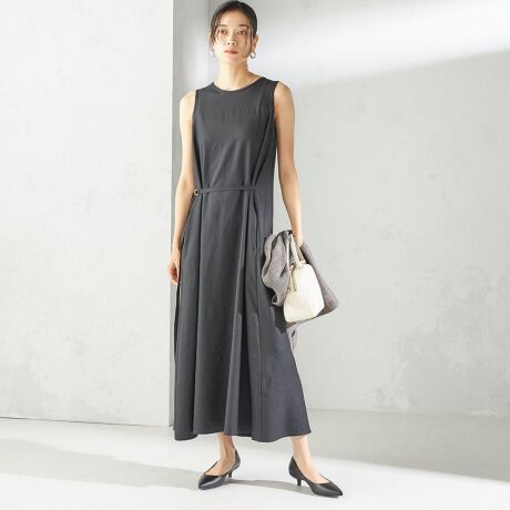 たっぷりと布を使った蹴回しが生み出す、胸元からの美しいドレープラインが印象的なノースリーブワンピース。