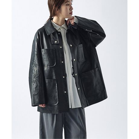 フェイクレザーのカバーオールに、青山氏のドローイングを刺繍した特別な一枚。