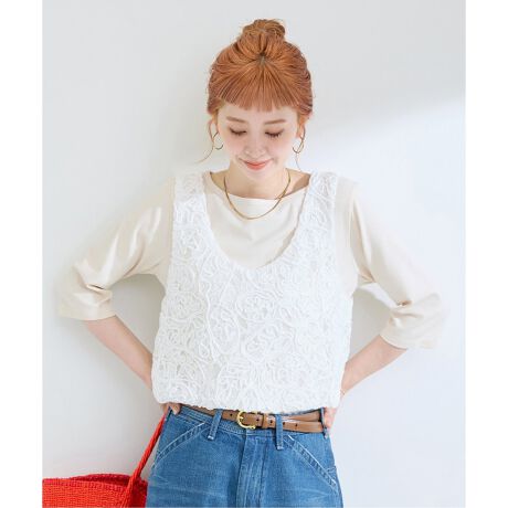 《2点セット》手洗い可 / レースタンク付き五分袖リブプルオーバー