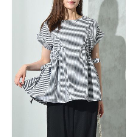 女性らしい優しいスタイルが出るよう、ギャザーのボリュームシルエットにこだわりました。サイドのリボンで絞りを調節できるのでお好みのシルエットアレンジが可能です。程よくハリ感のあるコットン混の素材を使用し、透け感もほとんどなく、シワが目立ちにくいのも◎