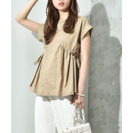 女性らしい優しいスタイルが出るよう、ギャザーのボリュームシルエットにこだわりました。サイドのリボンで絞りを調節できるのでお好みのシルエットアレンジが可能です。程よくハリ感のあるコットン混の素材を使用し、透け感もほとんどなく、シワが目立ちにくいのも◎