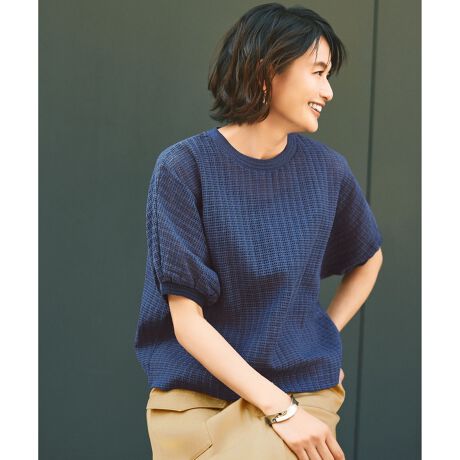 表面感のある素材を使用した1枚でも華やかなカットソー■デザインメッシュ組織が涼しげで華やかな印象のカットソーです。素材のユニークさを活かして、シンプルで程よくゆとりのあるシルエットで仕上げております。袖はドルマンスリーブになっているので、体にフィットし過ぎずリラックスした着こなしが楽しめます。何かを羽織ったりすることなく、1枚でスタイリングが決まるインパクトのあるデザインとなっております。■素材違う番手の糸を使用した凹凸のあるラッセル素材です。程よい透け感と表情のある表面感が特徴です。ハリを持たせる事でさらりとした風合いに仕上げました。襟や袖口には、リブ編みのニット使いでポイントを付けています。