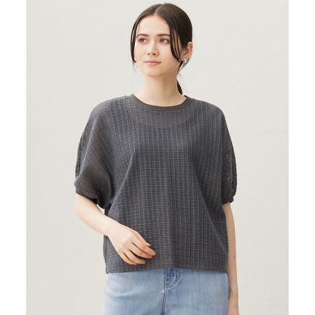 表面感のある素材を使用した1枚でも華やかなカットソー■デザインメッシュ組織が涼しげで華やかな印象のカットソーです。素材のユニークさを活かして、シンプルで程よくゆとりのあるシルエットで仕上げております。袖はドルマンスリーブになっているので、体にフィットし過ぎずリラックスした着こなしが楽しめます。何かを羽織ったりすることなく、1枚でスタイリングが決まるインパクトのあるデザインとなっております。■素材違う番手の糸を使用した凹凸のあるラッセル素材です。程よい透け感と表情のある表面感が特徴です。ハリを持たせる事でさらりとした風合いに仕上げました。襟や袖口には、リブ編みのニット使いでポイントを付けています。