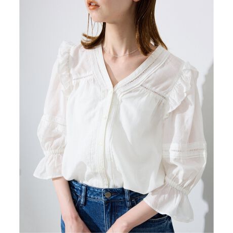 フリルデザインを大人に着こなせるようなVネック開きのコットン混ブラウス!
