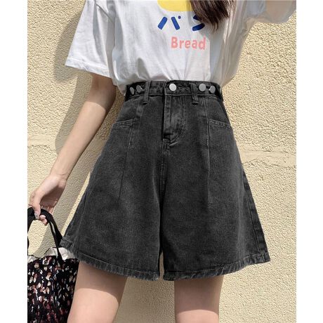 ウエストのボタンでサイズ調節が可能な、ハイウエストデニムハーフパンツ