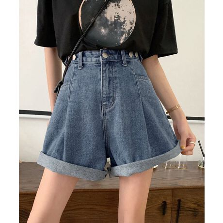 ウエストのボタンでサイズ調節が可能な、ハイウエストデニムハーフパンツ