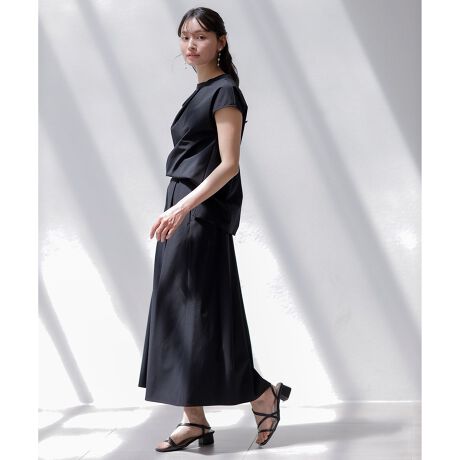 〈スカート〉・前はキレイ見えのミモレ丈タックスカート・前ウエストはベルト切り替えのフラット見えでスッキリ決まります