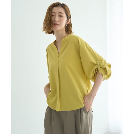 シンプルなスキッパーネックですっきりとした印象のボリューム袖ブラウス。