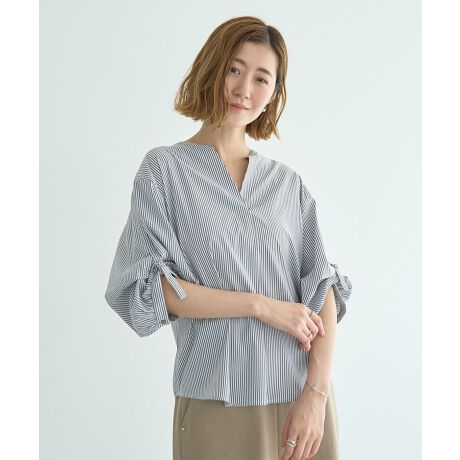 シンプルなスキッパーネックですっきりとした印象のボリューム袖ブラウス。