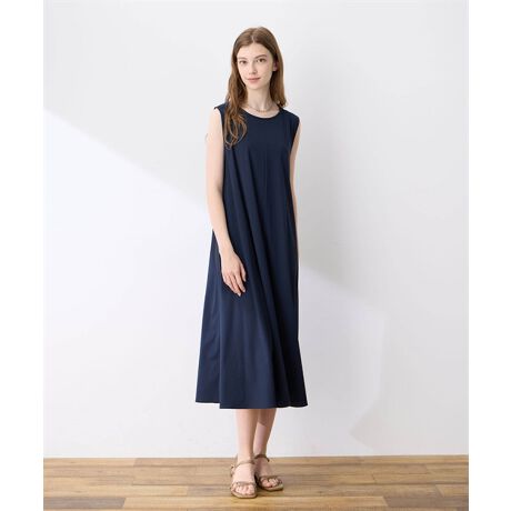 ボートネックとノースリーブが涼しげ印象を与えるトリコットワンピースです。