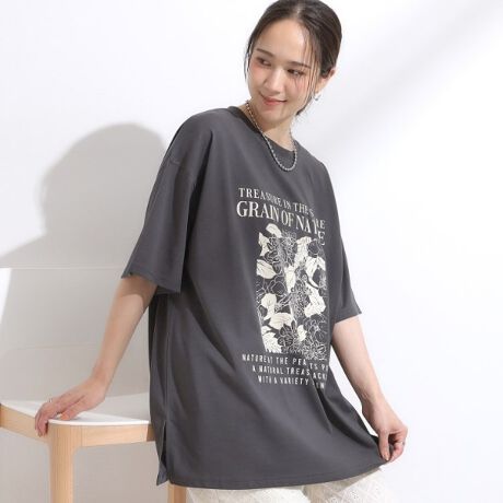 夏にうれしい汗染みジミ軽減加工・接触冷感機能のある素材を使用したオーバーサイズのプリントTシャツ。