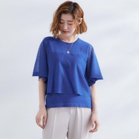 レーヨンナイロンのニット素材は、さらっとした肌触りで夏でも快適な着心地。