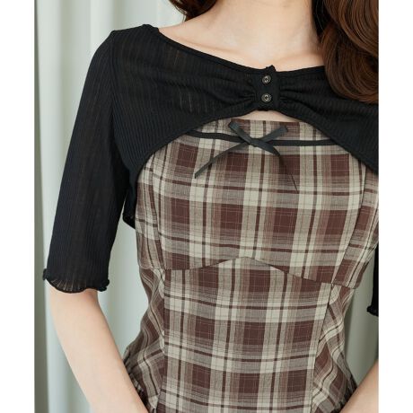 キャミワンピースはフロントにバイカラーのリボンをつけて、華やかな印象に。
